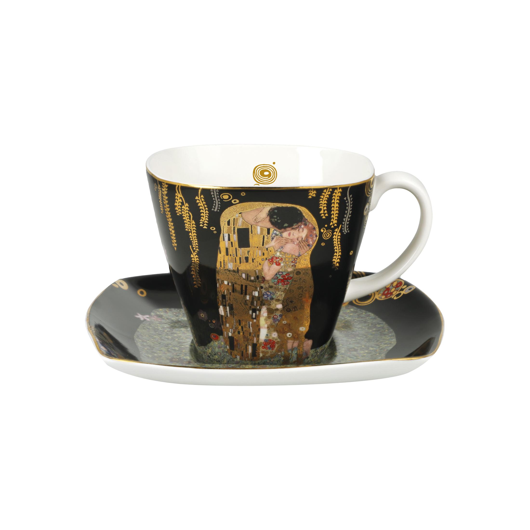 Der Kuss, entstanden in Gustav Klimts goldener Phase zwischen 1907 und 1908, ist eine der berühmtesten Liebesdarstellungen der Kunstgeschichte. Die in ornamentale Goldgewänder gehüllten Figuren strahlen zeitlose Innigkeit aus — festgehalten auf dieser eleganten Kaffeetasse aus Bone China mit aufwendiger Echtgoldauflage. Um die Brillanz der Farben und die Goldauflage zu schonen, ist Spülen per Hand mit mildem Reinigungsmittel empfehlenswert. Fassungsvermögen: 250 ml. Lieferung inklusive Geschenkverpackung.