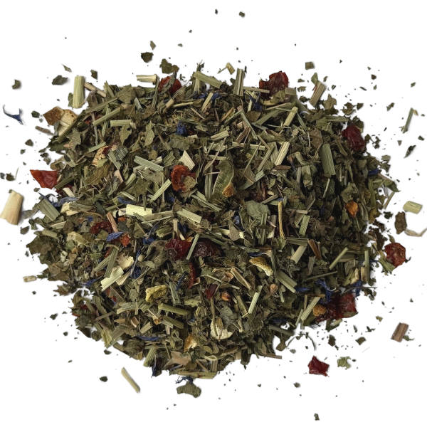| Zutaten: | Brombeerblätter, Lemongras, Hagebuttenschalen, Eisenkraut, Orangenschalen, Melisse, Passionsblumenkraut, Kornblumenblüten, Aroma: Zitronen-Orangen-Geschmack |